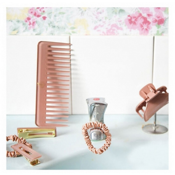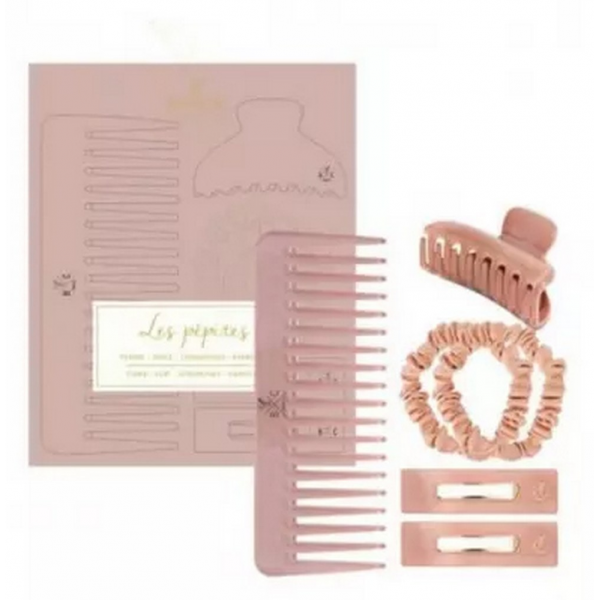 Coffret Les Pépites Bois de Rose : peigne opaline, pince, 2 barrettes et 2 chouchous en soie rose. Accessoires de coiffure essentiels pour sublimer vos cheveux. En savoir +