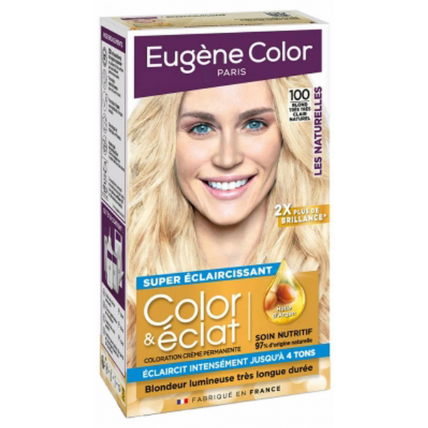 Découvrez la coloration creme permanente Eugene Color Color & Éclat Les Naturelles - super éclaircissant - 100 Blond tres tres clair naturel. Cette nuance offre des reflets naturels et lumineux sans décoloration parfaitement adaptés aux cheveux clairs à châtains. Élaborée avec soin par nos coloristes sa formule garantit une performance couleur exceptionnelle pour des cheveux deux fois plus brillants*. Enrichi en huile d-argan et exempt de silicones ce soin nourrissant renforce et apporte souplesse à vos cheveux pour une brillance incomparable. Le kit contient tous les éléments essentiels pour une application facile à domicile : 1 tube de creme colorante de 33mL 1 flacon applicateur de révélateur de 67mL 1 sachet de soin nutritif de 15mL ainsi qu-une notice une paire de gants et des protege-branches de lunettes.