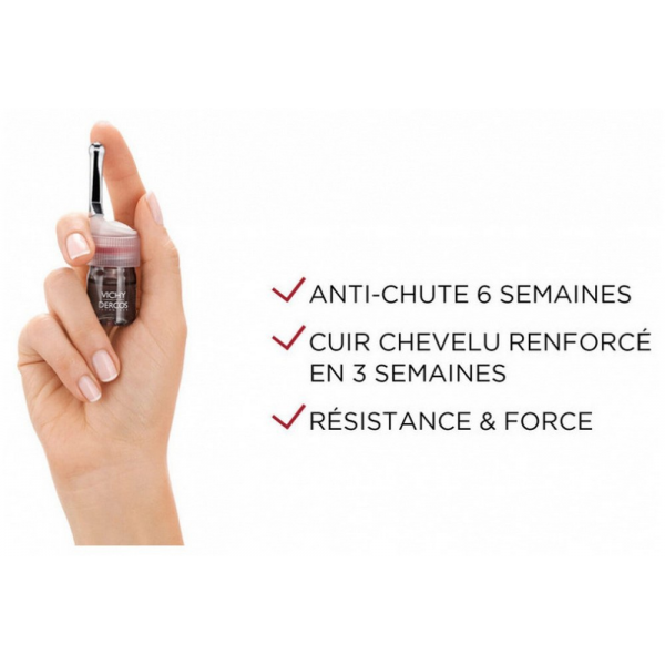 Grâce à sa formule associant l'Aminexil, molécule anti-chute référente avec 5 actifs (Arginine, SP94, vitamines PP/B6, octéine et en eau thermale de Vichy), ce traitement permet de lutter de la racine jusqu'à la pointe des cheveux.
