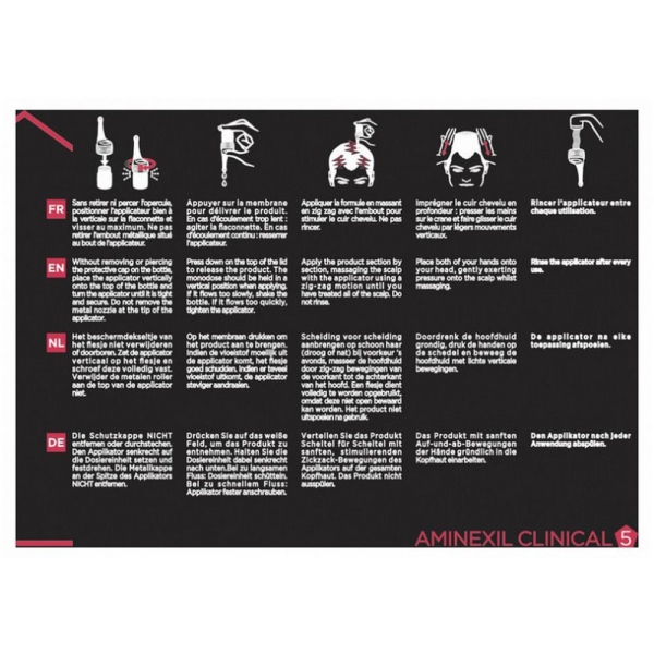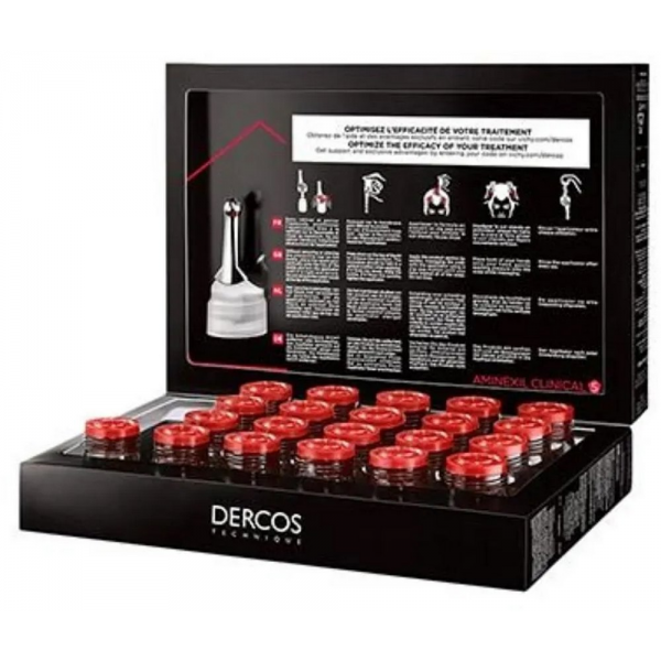 En cure d'attaque : appliquer une monodose Aminexil Clinical 5 par jour sur le cuir chevelu.