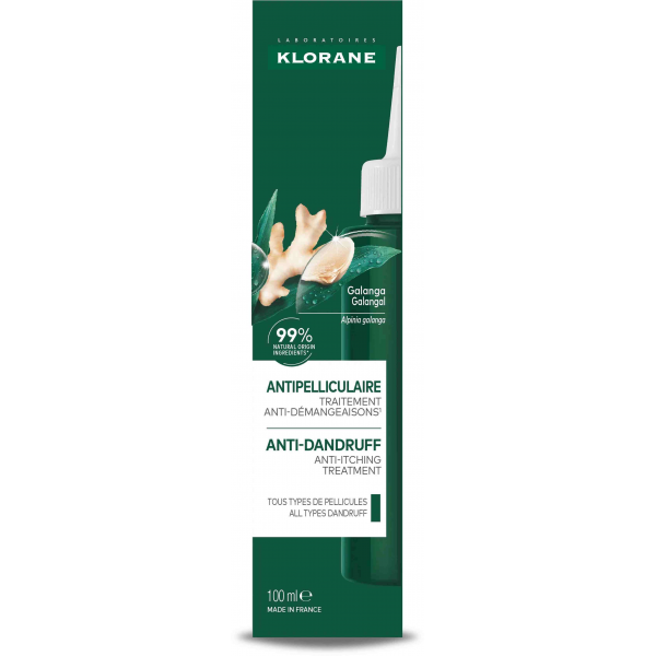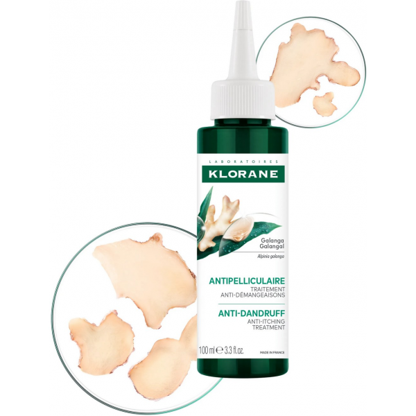 Klorane Traitement Antipelliculaire Anti-démangeaisons au Galanga médicinal apaise instantanément le cuir chevelu, diminue les démangeaisons tout en favorisant l'élimination des pellicules.