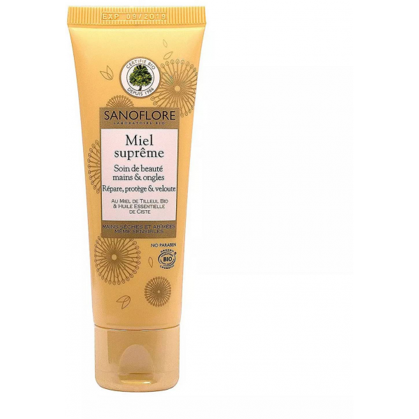 Sanoflore Miel Suprême Soin de Beauté Mains & Ongles à la texture onctueuse pénètre facilement sans laisser de film gras et convient aux peaux sensibles. Il laisse un délicat parfum aux notes fleuries et miellées.