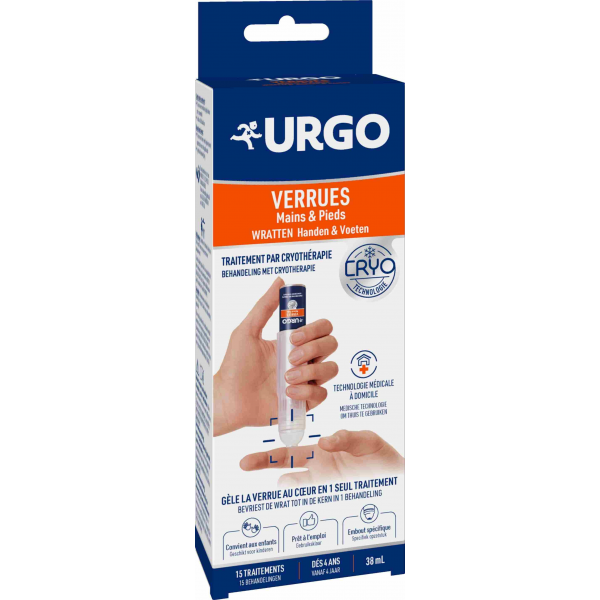 Urgo Verrues Cryothérapie permet de geler les verrues communes présentes sur les mains et sur les pieds. Ce produit utilise la cryothérapie, une méthode de traitement par le froid, et contient du dimethyl esther.