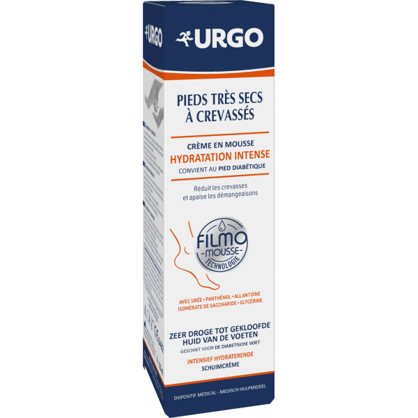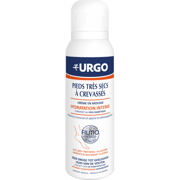 URGO Filmomousse Hydratation Intense est dédié au traitement de la peau très sèche et des crevasses des pieds, il convient au pied diabétique.