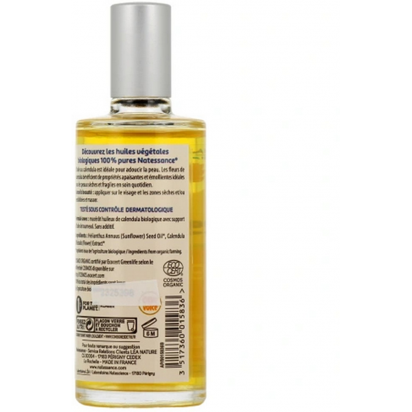 L'huile de calendula Natessance est obtenue par macération des fleurs de calendula dans l'huile de tournesol bio, elle possède des vertus apaisantes, protectrices et adoucissantes. L'huile de calendula permet de protéger la peau sensible et réactive, elle répare les zones sèches et rend la peau douce. Elle convient à tous les types de peau mais particulièrement aux peaux fragiles et réactives. Testée sous contrôle dermatologique.