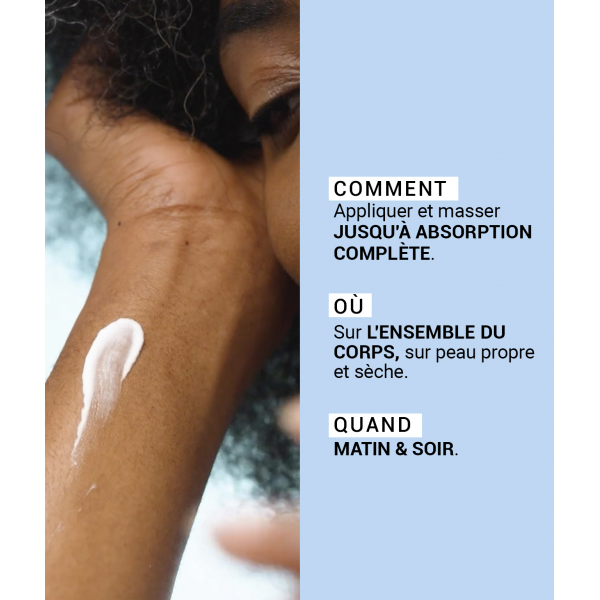 Sur une peau propre et sèche, matin et/ou soir, appliquer le lait fondant sur l'ensemble du corps.