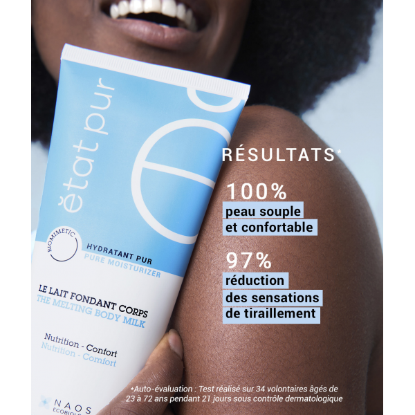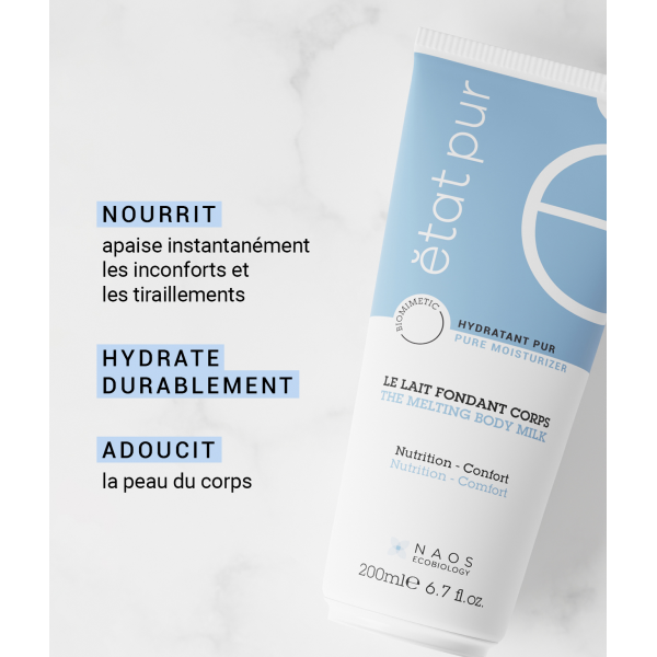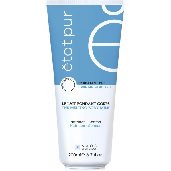 Spécialement formulé pour hydrater et nourrir votre peau, le lait fondant hydratant Etat Pur associe dans sa formule biomimétique des huiles végétales (tournesol, olive et soja) à de la glycérine hydratante.