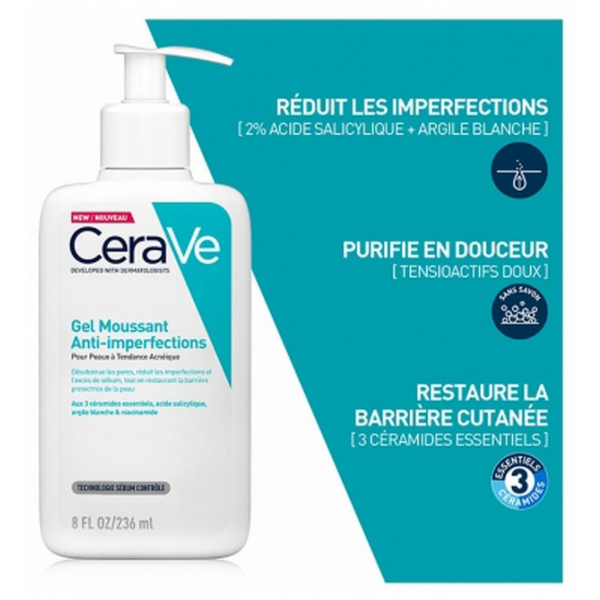Gel Moussant Anti-Imperfections 236 ml : INGREDIENTS: AQUA / WATER • COCAMIDOPROPYL HYDROXYSULTAINE • SODIUM LAUROYL SARCOSINATE • PROPANEDIOL • PEG-150 PENTAERYTHRITYL TETRASTEARATE • PEG-6 CAPRYLIC/CAPRIC GLYCERIDES • GLYCERIN • CERAMIDE NP • CERAMIDE AP • CERAMIDE EOP • CARBOMER • NIACINAMIDE • SODIUM METHYL COCOYL TAURATE • SODIUM BENZOATE • SODIUM CHLORIDE • SODIUM LAUROYL LACTYLATE • SODIUM HYALURONATE • CHOLESTEROL • PHENOXYETHANOL • DISODIUM EDTA • CITRIC ACID • TETRASODIUM EDTA • PHYTOSPHINGOSINE • XANTHAN GUM • ETHYLHEXYLGLYCERIN (F.I.L. D224330/3).