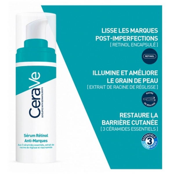 Développé avec des dermatologues, le sérum resurfaçant au rétinol CeraVe aide à lisser la texture de votre peau en réduisant l’apparence des marques post-acnéiques, en minimisant l’apparence des pores et en améliorant la surface de votre peau. Notre formule contient du rétinol encapsulé pour aider à refaire la surface de votre peau, ainsi que de l’extrait de racine de réglisse pour aider à éclaircir l’apparence de votre peau. De plus, il est formulé avec 3 céramides essentiels qui agissent ensemble pour emprisonner l’hydratation de la peau et aider à restaurer la barrière protectrice de votre peau, ainsi qu’avec de la niacinamide apaisante.