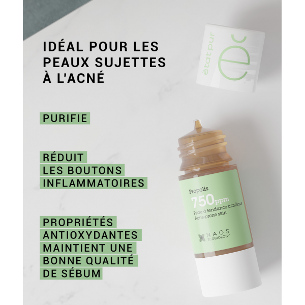 Pour assainir et purifier les peaux mixtes à grasses, le laboratoire Etat Pur a spécialement formulé un actif pur la propolis.