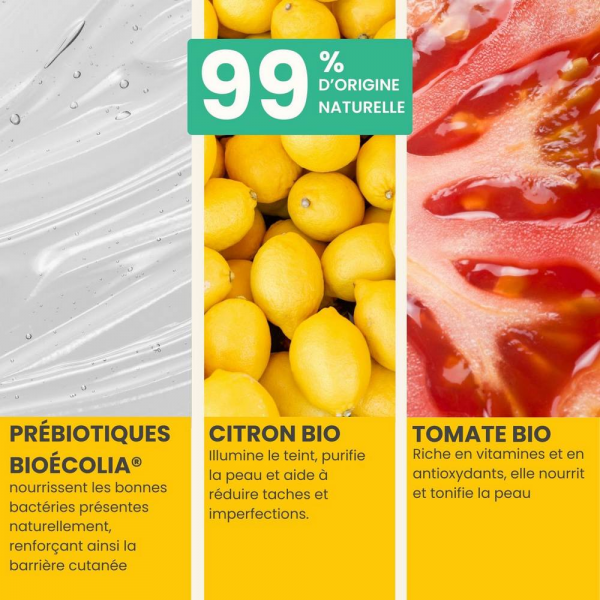 Son action est complétée par de l’eau de tomate, un mélange d’agrumes (citron- pamplemousse et orange), du bourgeon de cassis aux propriétés apaisantes et du Fucocert pour une peau plus lisse et hydratée.