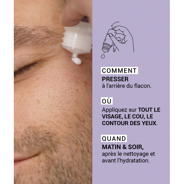 Matin et soir, après avoir nettoyé votre peau et avant d'appliquer votre crème hydratante (ne pas mélanger). Bien agiter avant utilisation.