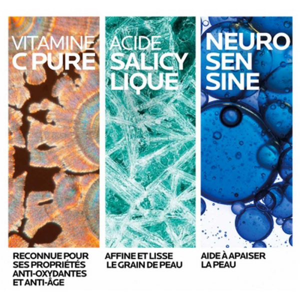 - Sérum : Aqua / Water / Eau, Ascorbic Acid, Dimethicone, Glycerin, Alcohol Denat., Potassium Hydroxide, Polysilicone-11, Silica, Pentaerythrityl Tetraethylhexanoate, Peg-20 Methyl Glucose Sesquistearate, Sodium Hyaluronate, Adenosine, Poloxamer 338, Ammonium Polyacryloyldimethyl Taurate, Hydrolyzed Hyaluronic Acid, Caprylic/Capric Triglyceride, Caprylyl Glycol, Citric Acid, Laureth-7, Trisodium Ethylenediamine Disuccinate, Bis-Peg/Ppg-16/16 Peg/Ppg-16/16 Dimethicone, Acetyl Dipeptide-1 Cetyl Ester, Xanthan Gum, Pentylene Glycol, Polyacrylamide, C13-14 Isoalkane, Tocopherol, Pentaerythrityl Tetra-Di-T-Butyl Hydroxyhydrocinnamate, Salicylic Acid, Parfum / Fragrance