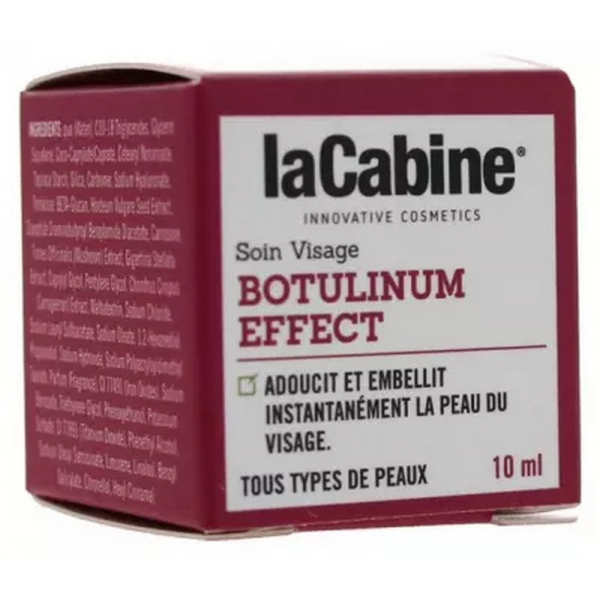 La crème LA CABINE Botulinum Effect de 10 ml est une solution anti-rides efficace. Grâce à sa formule à base de Bêta-glycanes, d’Acide Hyaluronique et de Peptides d’Embellissement, elle adoucit et embellit instantanément la peau du visage. Sa composition soigneusement sélectionnée agit sur l'apparence des rides d'expression pour tous types de peau. Le format de 10ml permet de découvrir le produit avant de l’adopter en format 50 ml ou il sera tout simplement votre compagnon idéal pour vos week-ends et voyages.