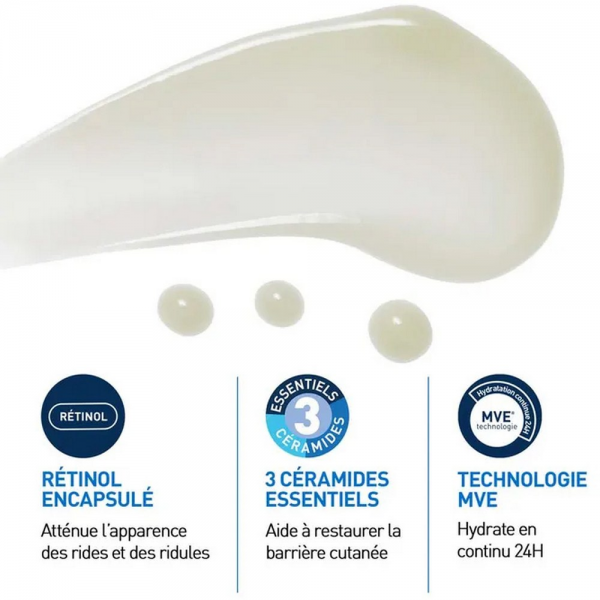Au cœur de sa formule, le rétinol encapsulé agit efficacement contre les signes du vieillissement tout en minimisant les risques d’irritation. L’acide hyaluronique hydrate en profondeur, la niacinamide apaise et renforce la barrière cutanée, et les trois céramides essentiels contribuent à restaurer et protéger l’épiderme.