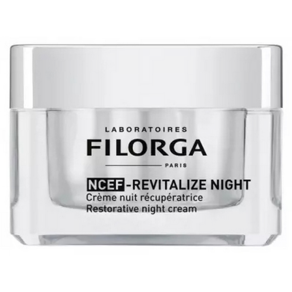 Découvrez la Crème Récupératrice Nuit 50 ml de la gamme Filorga NCEF - REVITALIZE NIGHT, un soin nocturne concentré en actifs revitalisants pour une régénération cellulaire optimale pendant la nuit. Sa formule innovante, enrichie en NCEF, un complexe unique inspiré des injections anti-âge, associé à un trio d'actifs, améliore la qualité des peaux fatiguées et stressées, offrant un teint visiblement plus jeune, lumineux et revitalisé. Cette crème associe également un peptide anti-rides (Matrikines) pour raffermir la peau, un extrait de Tephrosia Purpurea pour protéger du stress oxydatif et raviver l'éclat, ainsi que 2 % de niacinamide pour unifier le teint, renforcer la barrière cutanée et atténuer rougeurs et taches. Grâce à cette formule complète, la Crème Récupératrice Nuit convient à tous les types de peaux, offrant une solution idéale pour une routine de soin nocturne.
