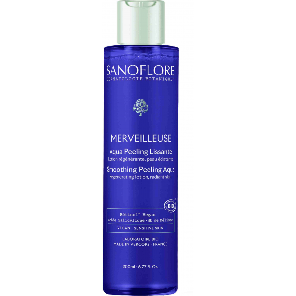 Aqua Merveilleuse est un peeling quotidien formulé avec de l'huile essentielle et de l'hydrolat de Mélisse bio aux vertus anti oxydantes, régénérantes et anti-âge, elle redonne élasticité et souplesse à la peau et apaise les peaux sensibles. Il contient également un extrait de bourgeon de Hêtre bio reconnu pour ses actions rajeunissantes, raffermissantes et anti âge. Ce peeling allie douceur et efficacité pour un effet peau neuve assuré. Sa texture biphasée eau et huile apporte fraîcheur et confort au contact de la peau.