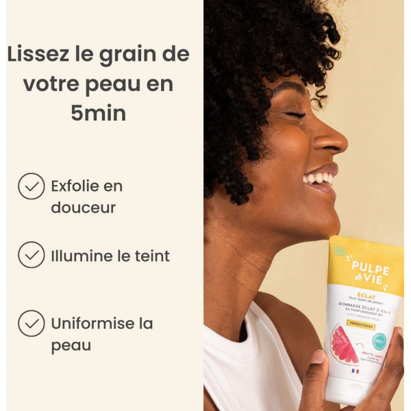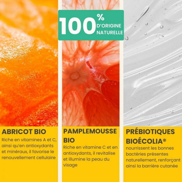 Soin 2en1 certifié Bio aux prébiotiques. Il hydrate, illumine le teint avec du pamplemousse Bio, apaise avec des prébiotiques, et exfolie en douceur avec des éclats d'abricot Bio. En savoir +