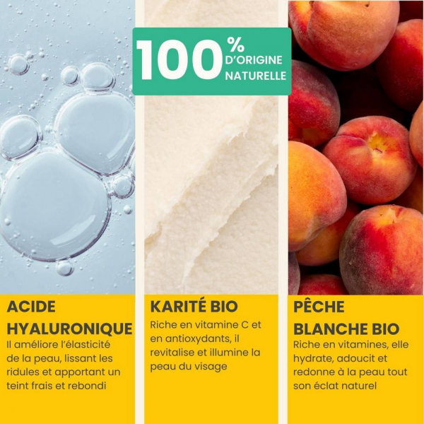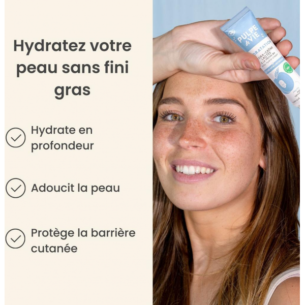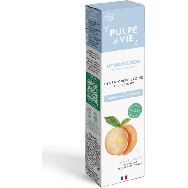La Crème Hydratante Visage Pulpe de Vie offre une hydratation naturelle, évitant le tiraillement. Sa formule à base de pêche blanche Bio, acide hyaluronique, aloe vera Bio, karité, et amande douce Bio, convient à tous les types de peaux. En savoir +