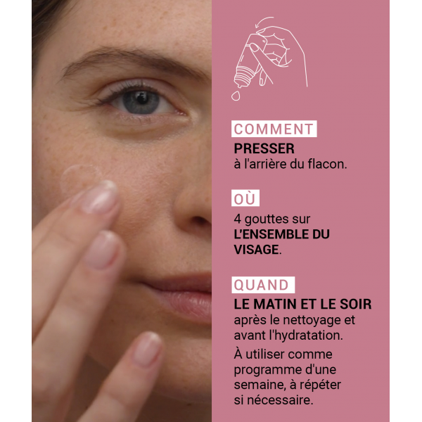 Matin et soir, sur une peau propre et sèche, appliquer 4 gouttes d'actif pur sur l'ensemble du visage.