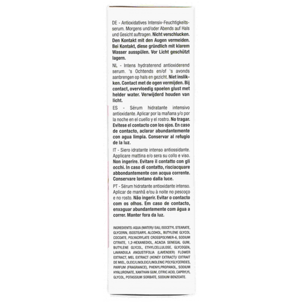 Ce sérum hydratant intense anti-oxydant est formulé avec des ingrédients soigneusement sélectionnés : Aqua, Isocetyl Stearate, Glycerin, Isostearyl Alcohol, Butylene Glycol Cocoate, Polyacrylate Crosspolymer-6, Sodium Citrate, 1,2-Hexanediol, et bien d'autres pour garantir une efficacité maximale et une tolérance optimale. Sa composition offre une hydratation des couches supérieures de l'épiderme, comme le confirme le test instrumental réalisé sur 10 volontaires pendant 24 heures.
