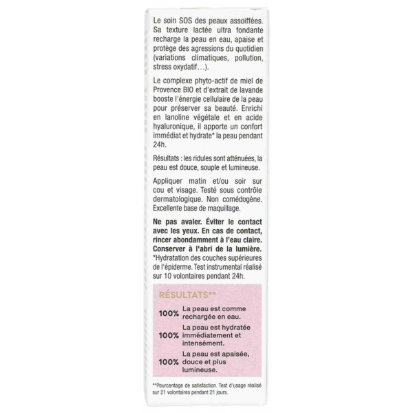 Le sérum hydratant intense anti-oxydant flacon pompe 30ml est le soin SOS idéal pour les peaux assoiffées. Sa texture lactée ultra fondante recharge la peau en eau, apaise et la protège des agressions du quotidien telles que les variations climatiques, la pollution et le stress oxydatif. Enrichi en complexe phyto-actif de miel de Provence BIO et d’extrait de lavande, ce sérum booste l’énergie cellulaire de la peau pour préserver sa beauté. De plus, la présence de lanoline végétale et d'acide hyaluronique offre un confort immédiat et une hydratation pendant 24 heures. Les résultats sont visibles : les ridules sont atténuées, la peau devient douce, souple et lumineuse. Ce sérum est composé à 95% d'ingrédients d'origine naturelle pour répondre aux besoins des peaux sensibles déshydratées.