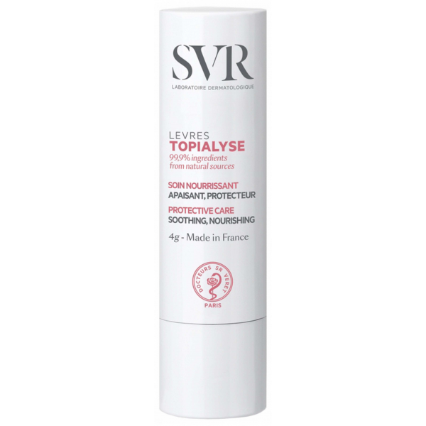 Découvrez le SVR Topialyse Lèvres 4 g, un soin des lèvres conçu pour nourrir, apaiser et protéger des agressions extérieures telles que le froid, le vent et le soleil. Sa formule minimaliste naturelle associe 11% de cires végétales, 84% d'huiles végétales riches en Omégas 3, 6, 9, 5% de beurre de karité et de la vitamine E antioxydante protectrice. Lisse et confortable toute la journée, ce soin offre un sourire retrouvé. Fabriqué en France, il est composé à 99,9% d'ingrédients d'origine naturelle.
