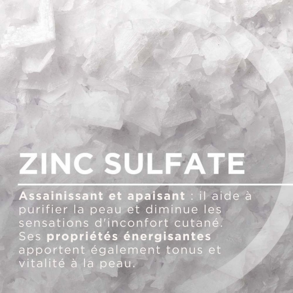 Il est composé à partir de sulfate de zinc et sulfate de cuivre qui assainit l’épiderme, réduit le nombre d’imperfections et limite la sécrétion de sébum.