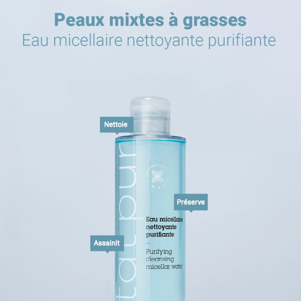 L’eau micellaire Etat pur est spécialement formulée pour prendre soin des peaux mixtes à grasses et sensibles.
