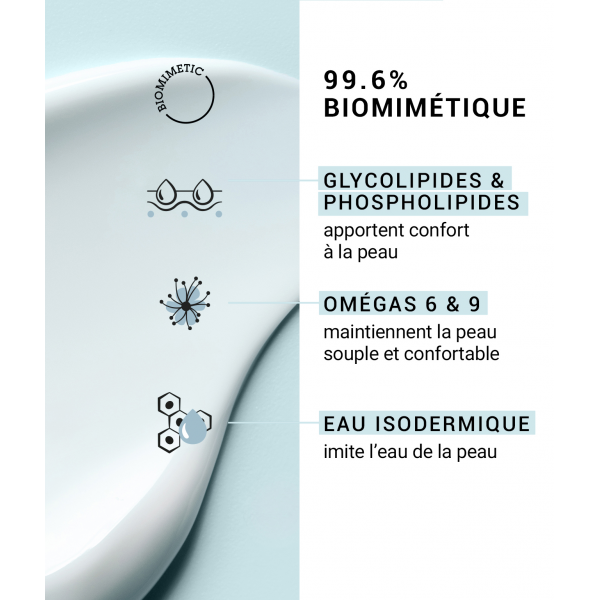 Sa formule biomimétique associe les huiles végétales de tournesol, de soja et d’olive et des agents hydratants pour nettoyer votre peau en douceur.