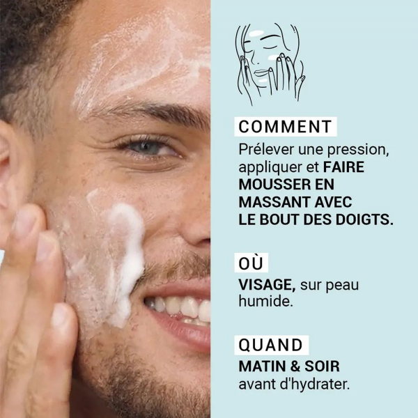 Matin et soir, appliquer une noisette de mousse sur le visage humide, masser et rincer à l'eau claire.