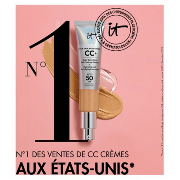 La CC Crème Correctrice Haute Couvrance Your Skin But Better CC+ Cream SPF 50+ est le best-seller des ventes aux États-Unis ! Développée en partenariat avec des dermatologues et chirurgiens plasticiens américains, cette crème innovante combine les bénéfices d'un fond de teint haute couvrance, d'une protection SPF 50+ anti-âge et d'un soin hydratant. Elle camoufle les imperfections, hydrate la peau et offre une couvrance impeccable sans s'effriter ni marquer les plis. Enrichie en actifs anti-âge tels que le collagène hydrolysé, les peptides, la niacine, l'acide hyaluronique, les antioxydants et les vitamines, elle agit comme une routine tout-en-un pour un teint parfait instantané.