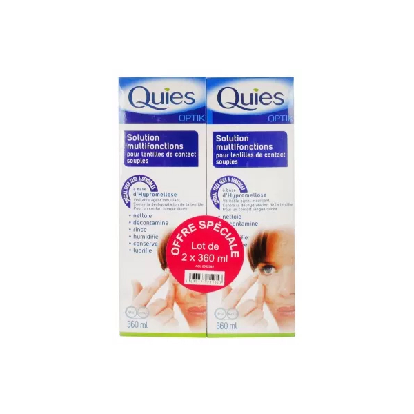 Le Quies Optik Solution Multifonctions Lot de 2 x 360 ml est une solution polyvalente conçue spécialement pour l'entretien des lentilles de contact souples. Grâce à ses multiples fonctions, cette solution offre une gamme complète de soins pour vos lentilles. Elle nettoie, décontamine, rince, humidifie, conserve, lubrifie et élimine les dépôts protéiques. Sa formule à base d'hypromellose agit efficacement contre la déshydratation des lentilles, assurant un confort durable.