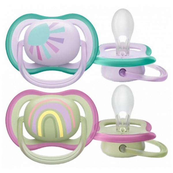 Avent Ultra Air 2 Sucettes Orthodontiques Silicone avec Motif 0-6 Mois - Modèle : Soleil et Arc-en-Ciel
