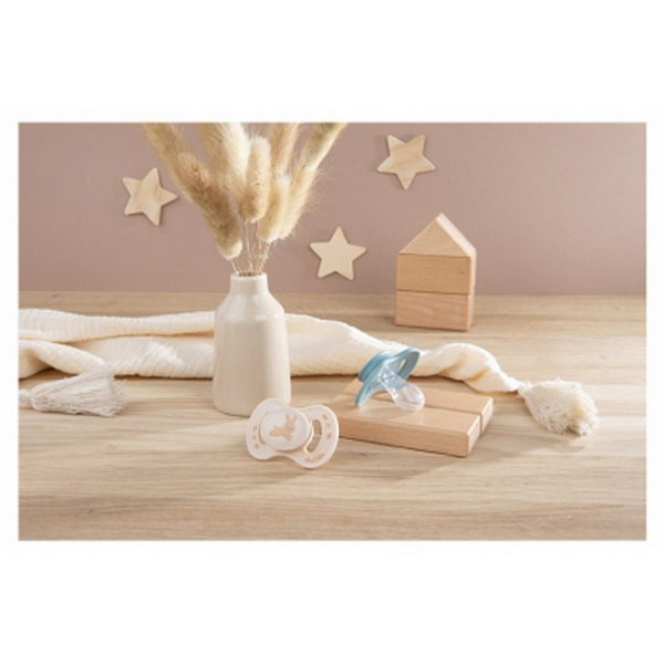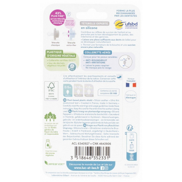 Le Duo de sucettes "Nature" 0-6 mois Lapin avec téterelle anatomique extra-fine - Luc et Léa est un choix écologique et sain pour votre bébé. Fabriquées en France et en Allemagne, ces sucettes offrent une approche éco-conçue en revalorisant les déchets végétaux pour créer une collerette en plastique d'origine végétale, certifiée ISCC, favorisant ainsi l'économie circulaire. De plus, la téterelle en silicone de grade médical, 43% plus fine qu'une sucette anatomique ordinaire, est recommandée par des dentistes et odontopédiatres de l'UFSBD pour assurer un bon développement bucco-dentaire chez les nourrissons de 0 à 6 mois.