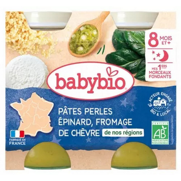Babybio Bonne Nuit Pâtes Perles Épinard Fromage de Chevre 8 Mois et + Bio Pots 200 g x 2