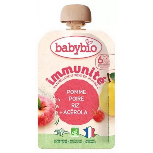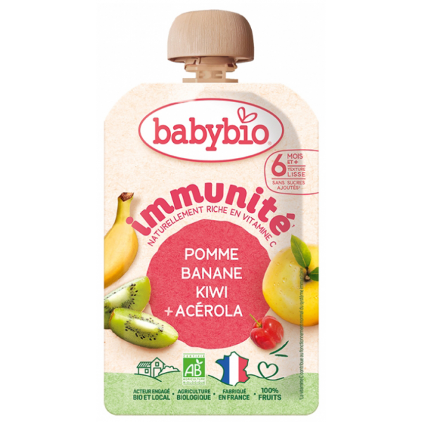 Pommes de France* 54.6% bananes d-Equateur* 25% kiwis de Nouvelle-Aquitaine* 20% poudre d-acérola* 0.4%.