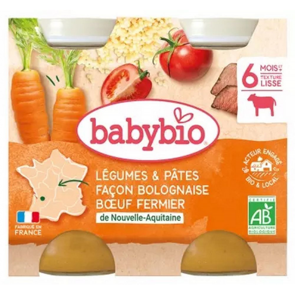 Babybio Légumes & Pâtes Façon Bolognaise au Bœuf Fermier 6 Mois et + 2 Bio Pots 200 g
