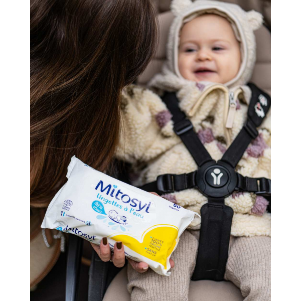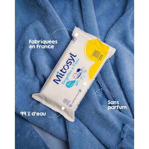 Les lingettes à l'eau Mitosyl sont parfaites pour un usage quotidien dès la naissance (sauf pour les prématurés et grands prématurés) et même en cas de peau sensible grâce à leur composition à 99% d'eau. Elles nettoient en douceur et en un seul geste la peau de bébé que cela soit le visage, le corps, les mains ou le siège. Votre bébé retrouvera alors une peau propre, fraîche et toute douce au toucher. Ces lingettes sont compostables, elles sont fabriquées en fibres 100% végétales et naturelles.