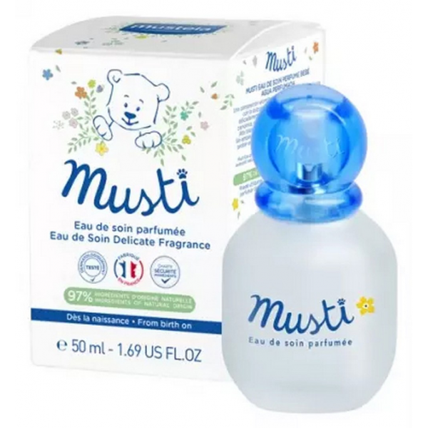 Parfumez votre bébé avec Musti eau de soin parfumée, composé à 92% d'ingrédients d'origine naturelle. En savoir +
