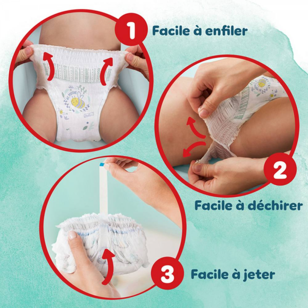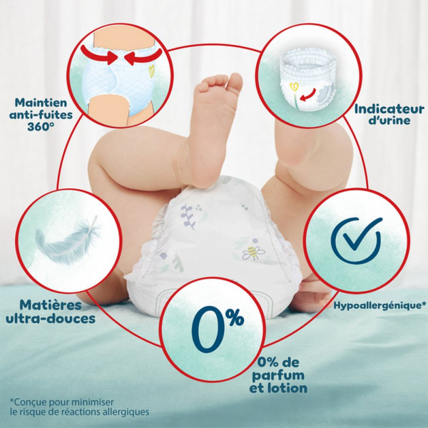 Les Pampers Harmonie Pants offrent à votre bébé une protection exceptionnelle associée à une grande douceur. Grâce à leur composition à base de coton de haute qualité, de fibres d'origine végétale et d'autres ingrédients soigneusement sélectionnés, ces couches-culottes hypoallergéniques sont testées dermatologiquement et garantissent une douceur optimale pour la peau délicate de bébé. De plus, leur capacité d'absorption exceptionnelle assure une protection longue durée, tout en réduisant les risques d'irritation.