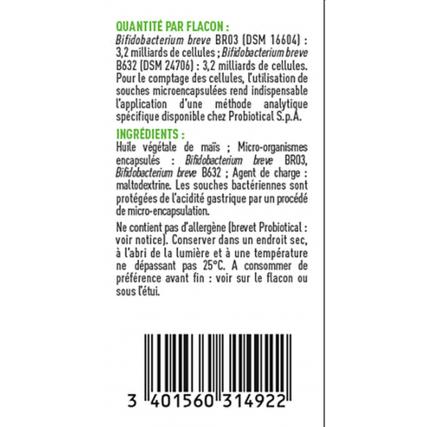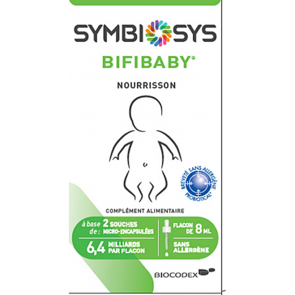 Bifibaby est un complément alimentaire qui contient les souches bactériennes Bifidobacterium breve BR03 et Bifidobacterium breve B632, dosées à 6,4 milliards par flacon. Ces souches bactériennes font partie des probiotiques, ils aide à une action favorable sur la flore intestinale du nourrisson, encore immature. Très bien toléré, ce complément alimentaire est adapté aux nourrissons dès la naissance. Il contribue au bien-être du système digestif du bébé, aide à soulager les gaz et ballonnements, pour un bébé plus serein et apaisé.