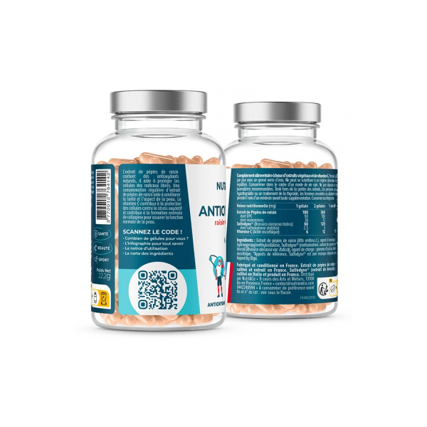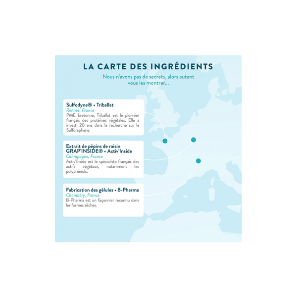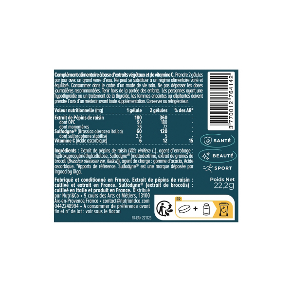 Extrait de pépins de raisin (Vitis vinifera L. Vitaceae) gélule d-origine végétale: hydroxypropylméthylcellulose Sulfodyne® [Maltodextrine Extrait de graines de brocoli (Brassica oleracea var. italica) gomme d-acacia] acide ascorbique.