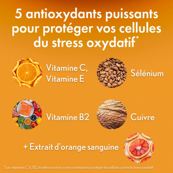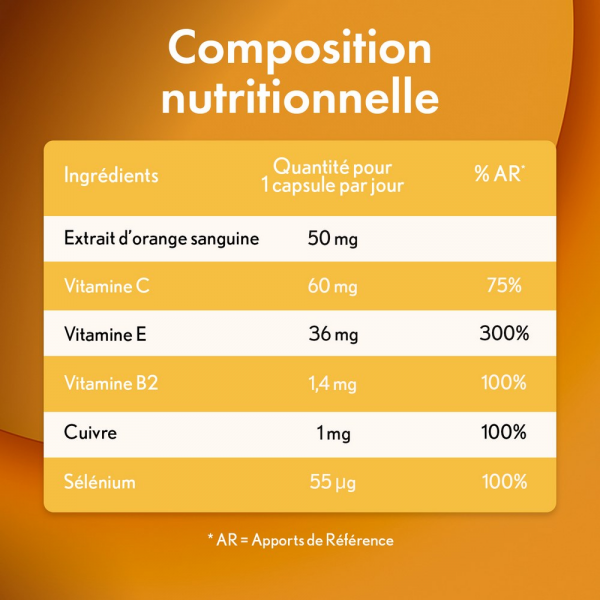 Ingrédients : Huile végétale (huile d’onagre – Oenothera biennis L., graine), gélatine bovine, acide L-ascorbique (vitamine C), D-alpha-tocophérol (vitamine E), extrait d’orange sanguine (Citrus sinensis (L.) Osbeck, fruit), affermissant (glycérol), émulsifiant (lécithines de soja), épaississant (cire d’abeille jaune), L-sélénométhionine, gluconate de cuivre, riboflavine (vitamine B2), colorant (oxydes et hydroxydes de fer).
