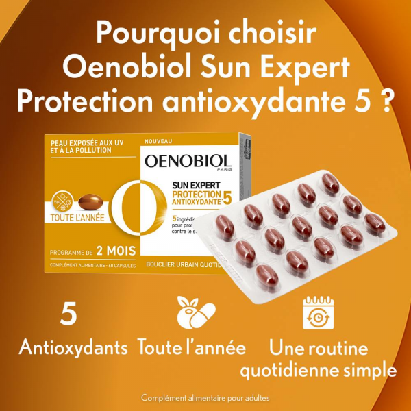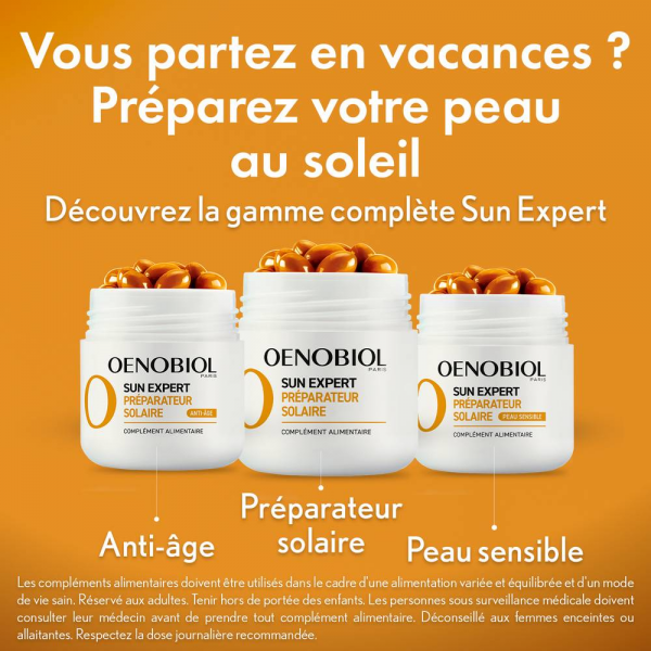 Complément alimentaire Sun Expert d'Oenobiol, protège la peau du stress oxydatif tout au long de l'année. En savoir +
