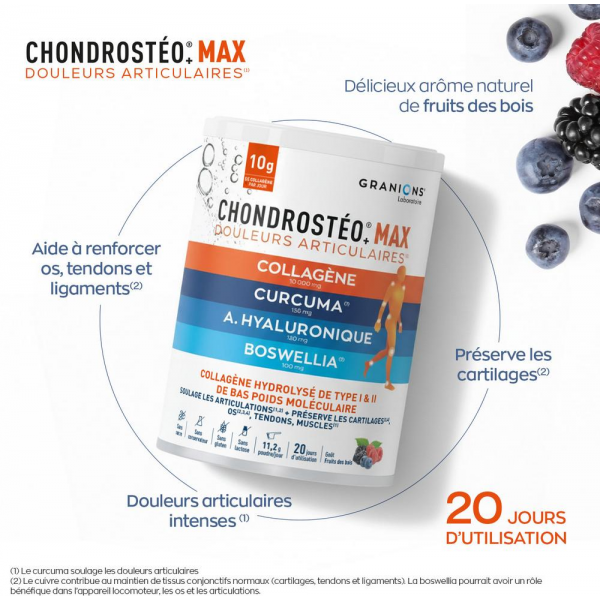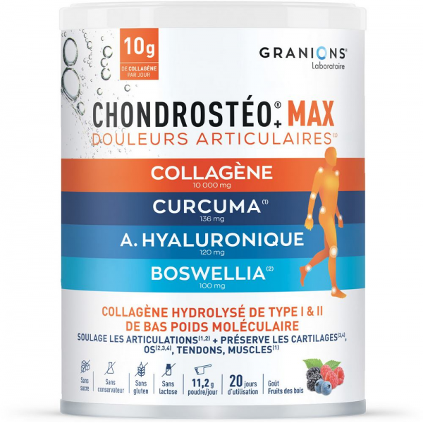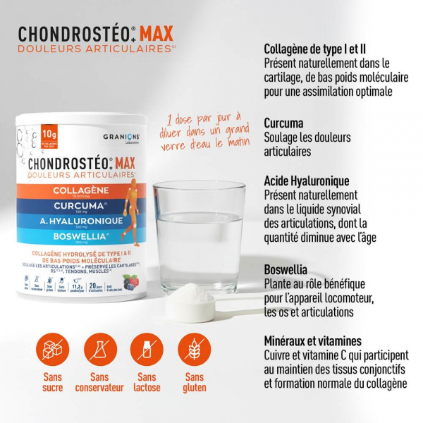 Granions Chondrostéo Max Collagène est un complément alimentaire en poudre formulé pour soutenir le confort articulaire, préserver la souplesse et accompagner la mobilité au quotidien. Sa formule complète agit à la fois sur la lubrification articulaire, la ... En savoir +