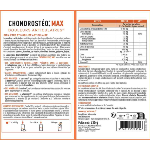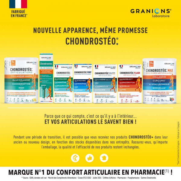 Fabriqué en France, Granions Chondrostéo Max s’adresse aux personnes souhaitant préserver durablement leurs articulations et maintenir une mobilité optimale.