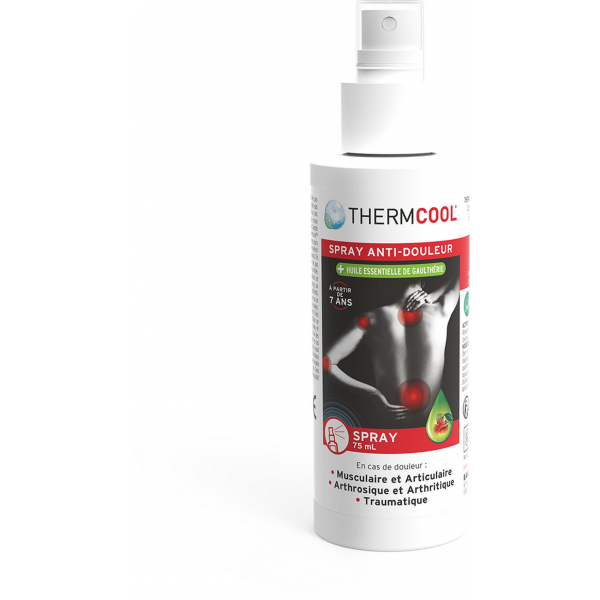ThermCool Spray Gaulthérie est un dispositif médical destiné au soulagement des douleurs musculaires et articulaires. Sa formule associe le salicylate de méthyle à l’huile essentielle de gaulthérie pour une action apaisante ciblée. Il contribue à soulager rapidement les sensations douloureuses après un effort physique. Ce spray peut également être utilisé en phase de récupération ou en cas de douleurs post-traumatiques. Son mode d’application en spray permet une utilisation simple et précise. Il est particulièrement adapté aux zones difficiles d’accès comme le dos ou les épaules. Thermcool Spray convient aux adultes et aux enfants dès 7 ans. Il s’intègre facilement dans une routine de soins musculaires et articulaires. Non gras - Ne tache pas - Ne colle pas. Sans conservateur ajouté'