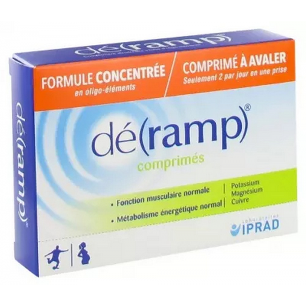 Décramp, ou Dé(ramp), Comprimés est un complément alimentaire utilisé pour assurer une fonction musculaire normale et favoriser un métabolisme énergétique normal. DéCramp du Laboratoire Iprad est un produit à base d'oligo-éléments tels que le magnésium, le potassium et le cuivre. Pratiques à consommer, les comprimés de DéCramp, du Laboratoire Iprad, favorisent la récupération musculaire. Concentré en cuivre, en magnésium et en potassium, ce complément alimentaire agit pour apaiser les tensions et les douleurs musculaires. Grâce à l’action synergique de ces trois éléments naturellement présents dans l’organisme, ils améliorent le bien-être physique et psychologique.