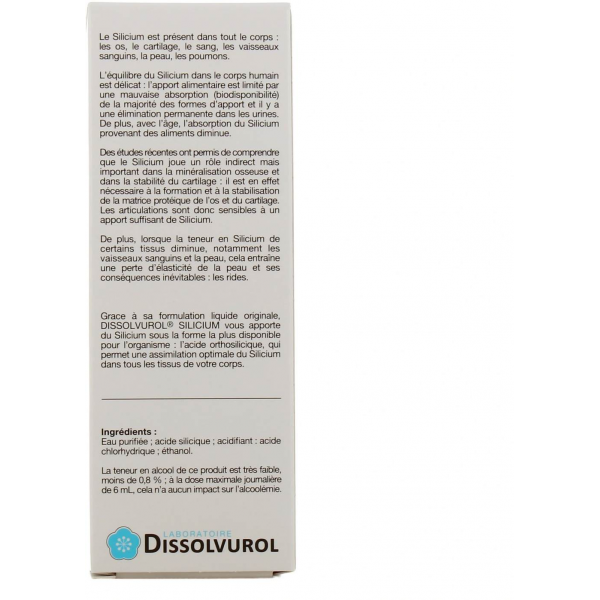 L'apport alimentaire du Silicium est limité par la mauvaise biodisponibilité des formes apportées. De plus, le silicium est en permanence éliminé dans les urines. Il faut également savoir qu'avec l'âge, la teneur en silicium de certains tissus diminue. C'est avec tous ces paramètres que Dissolvurol Silicium commercialise une forme particulière de silicium : l'acide orthosilicique. Il s'agit de la forme la plus biodisponible pour l'organisme. Cette forme est ainsi facilement assimilée dans tous les tissus du corps, notamment la peau.